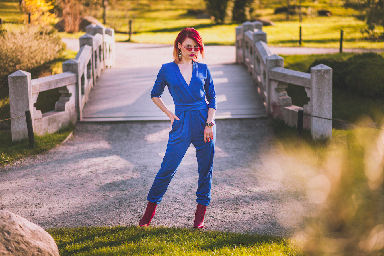 Seekordne fotoseeria sündis Kadrioru pargis, pildistas taaskord Kermo Vahula. Soovisin üles pildistada Tallinn Dollsi jumpsuit’i, mis on minu kapis olnud eelmisest suvest saadik. Kuna võtsin vahepeal kaalust tugevalt alla, siis istub ta seljas vabamalt kui kunagi varem. Jalga sikutasin Aldo täisnahast punased saapad, milled pärast esimest kandmist kohe ära rikuti ja mingit tumedat jooki peale valati. Võib-olla pole ööklubi õige koht, kuhu uute kallite saabastega minna 😉