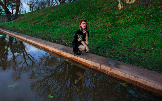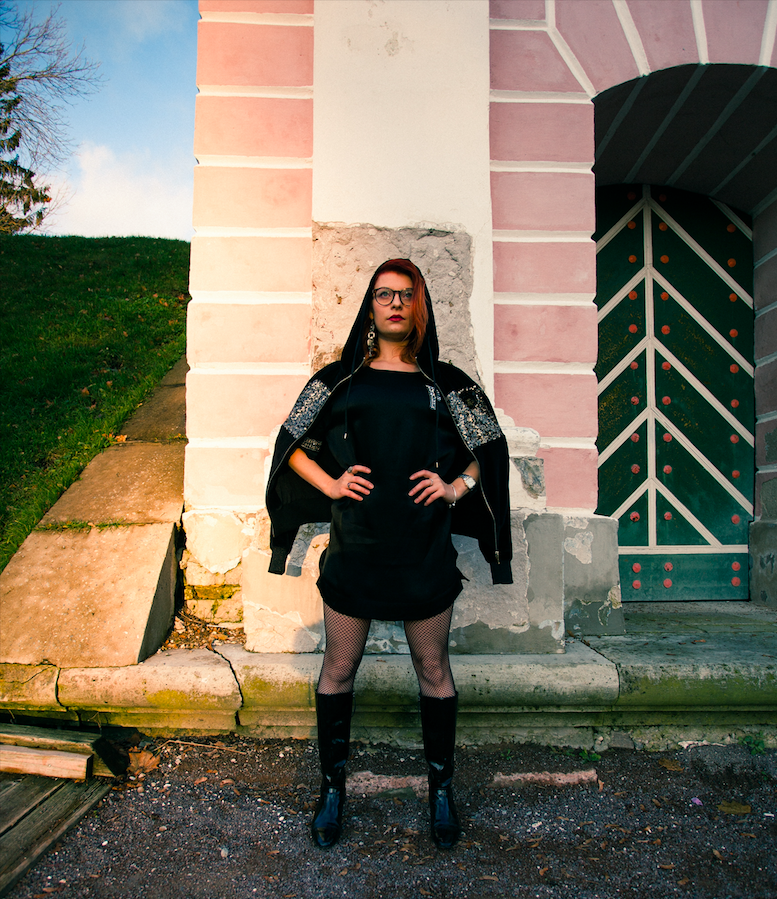 Meie sügisesele pildistamisele Gretega mu kodulinnas Pärnus sobitasin juurde sama brändi sametist kuldsete litritega sooja dressipluusi, võrksukad ning nahast kuldse Kadri Kruusi käekotikese. Lakksaapad tõi mulle ema reisilt Leedust. Kogu komplekt on ühtaegu pidulik ja väääga mugav.