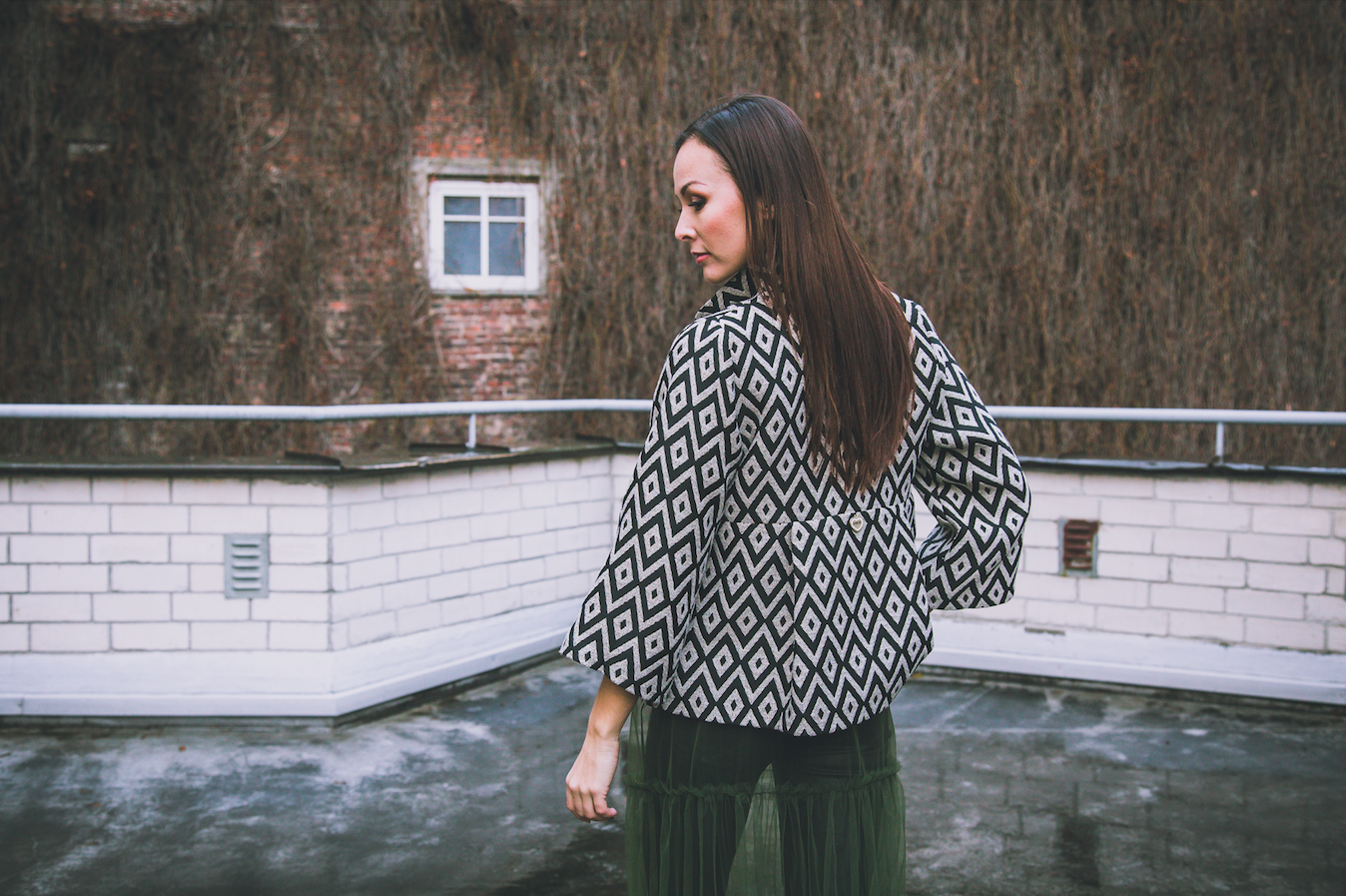 Niisiis oli minu silmis brünett kaunitar Kristel ideaalne valik modelliks! Esimese komplekti valisin natukene seksikama ja mängulisema. Roheline vallatult läbipaistev Isabelle Blanche’i kleit sobib kanda igapäevaselt t-särgi ja teksade peal või pidulikul sündmusel väikese jakikese all. EAN13 rombidega mustvalge jakk võitis mu südame kohe silmapaistva mustri ja põnevate naiselike detailide poolest.